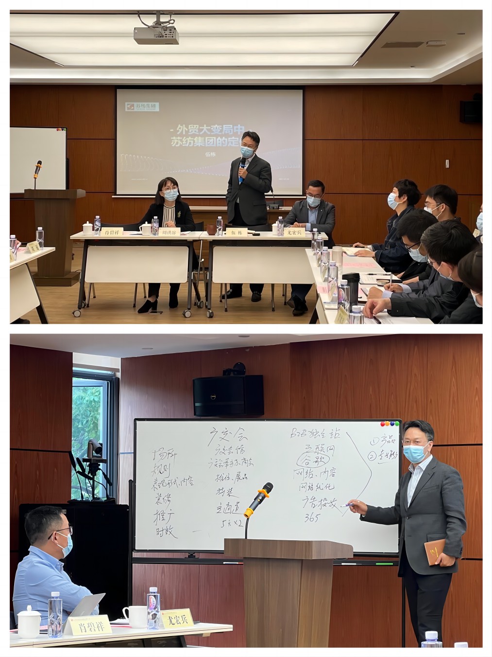 本次研讨会由集团电商事业部副经理刘通主持。苏纺集团董事长伍栋亲自从何为变局,我是谁,我遇到了哪些困难,接下来怎么办等分析讲授《外贸大变局下苏纺的定位》。通过研讨方式现场解析建站内涵、分析客观现状、讨论打造工作内容、勾勒出苏纺集团跨境电商高质量发展目标、探寻正确的发展定位和方法路径,现场气氛热烈,掌声不断。
