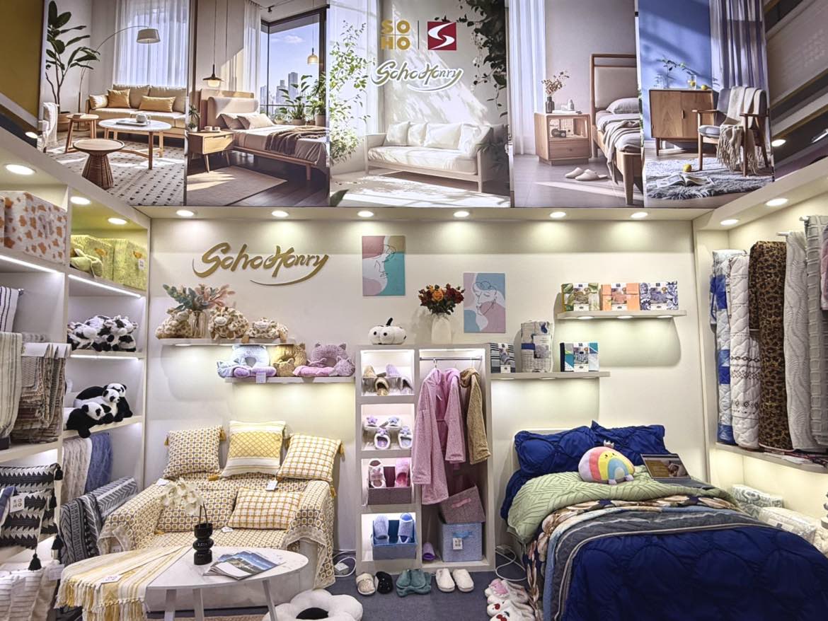 为全方位彰显大苏豪品牌形象,本次广交会轻纺4个摊位以“情景化、场景式呈现”创新设计理念进行整体装修。通过搭建沉浸式家居成套装饰场景,巧妙融合主营产品与装饰展品,让客户在实景体验中直观感受产品的实用价值与美学魅力。