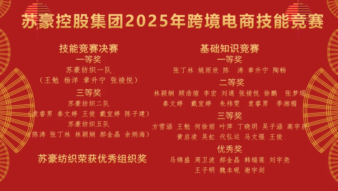 近日,在苏豪控股集团举办的“苏豪新精彩 跨境创未来”2025年跨境电商技能竞赛中,苏豪纺织荣获一等奖、三等奖和优秀组织奖等多项荣誉,展现较好的专业素养和团队风貌。