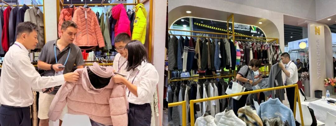 服装展位亮点纷呈。服装事业部将多款针梭织拼接外套,与前期畅销的毛绒类外套进行系列化组合,同时运用新型提花、滴塑工艺,让面料表面呈现流动纹理质感,以细节创新打造产品差异化。针织事业部聚焦年轻消费群体,推出动物、费尔岛提花、字母三大潮流系列,兼顾时尚与日常穿搭,凭借丰富图案与色彩,为采购商提供更多搭配选择。童装区域,新潮的户外滑雪服系列具备防水、防风、透气、透湿功能,并提供从设计到生产的一站式解决方案,满足采购商的个性化定制需求。团队更发挥跨部门融合作用,首次展出童装睡衣裤与浴袍系列组合,在多元场景下吸引大量采购商关注。同时本届服装展位在设计理念与场景布局上的全面出新得到了上级巡馆领导充分肯定。