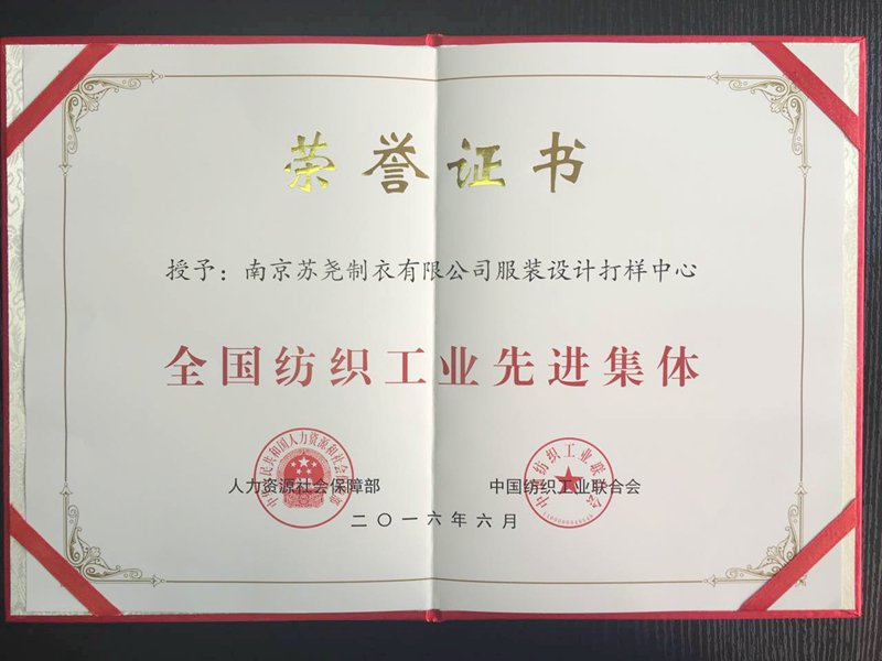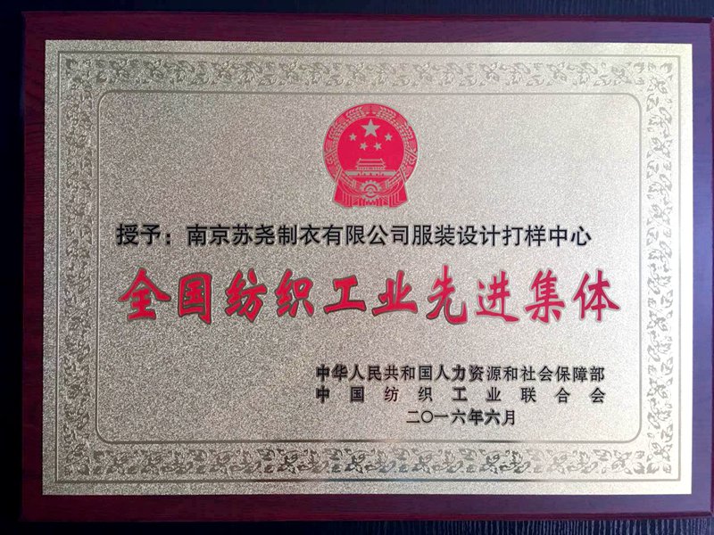 南京苏尧制衣服装设计打样中心荣获“全国纺织工业先进集体”荣誉称号