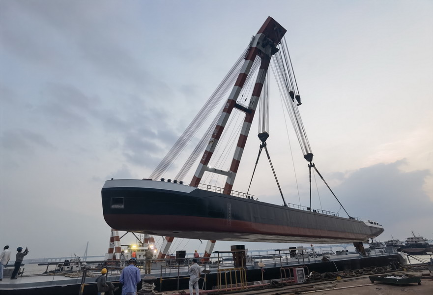 继2020年6月15日泓瑞公司正式签署了船舶出口合作合同后,公司领导高度重视项目进展,苏纺集团董事长伍栋、副总经理阚建兴和总经理助理陈实多次亲赴现场,泓瑞公司副总经理刘卫东定期去船厂了解进度,相关业务和财务、单证等部门对项目紧密跟踪。船舶上船台后,公司派遣业务员长期驻厂,节假日不休息,在确保安全、保证质量的情况下,抢抓工期,排除一切困难,督促协调生产进度,全力以赴完成工程。整个工程历时15个月,虽然期间历尽波折,但两艘驳船终于建造成功,取得法国BV船级社证书,在运输母船离港前完成吊装,正式通关运往荷兰。