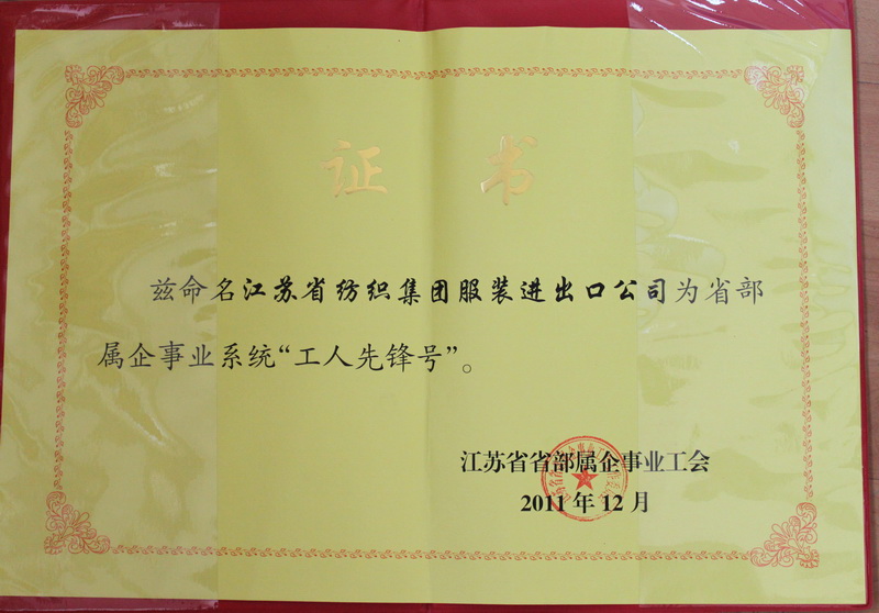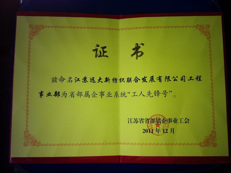 近日,纺织集团所属两家企业------江苏省纺织工业(集团)服装进出口有限公司和江苏远大新纺织联合发展有限公司工程事业部被江苏省总工会授予2011年度江苏省省部属企业系统“工人先锋号”光荣称号。至此,纺织集团已有五家企业获此殊荣。