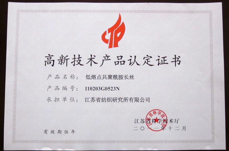 省纺研所研发的低熔点共聚酰胺长丝荣获得江苏省高新技术产品证书