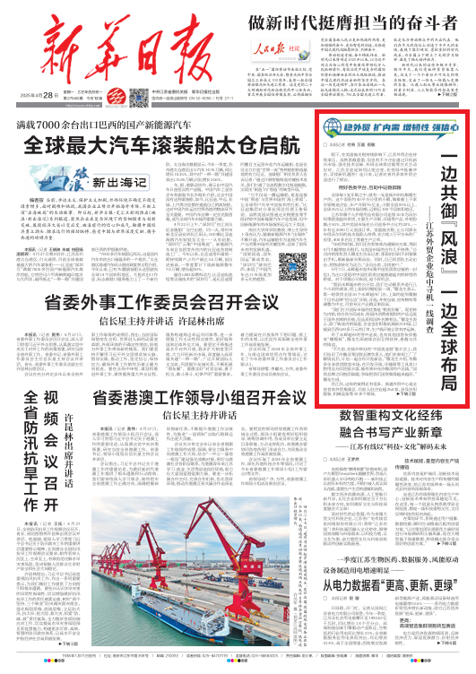 眼下,在美滥施关税持续影响下,江苏外贸企业持续承压。虽然困难重重,但也有不少企业通过开拓新兴市场、强化技术创新、布局全球供应链等方式主动应对。苏豪纺织集团以变应变,在变局中抵御冲击、寻找新机遇,受到新华日报关注和报道。