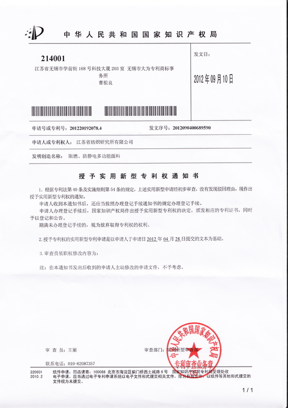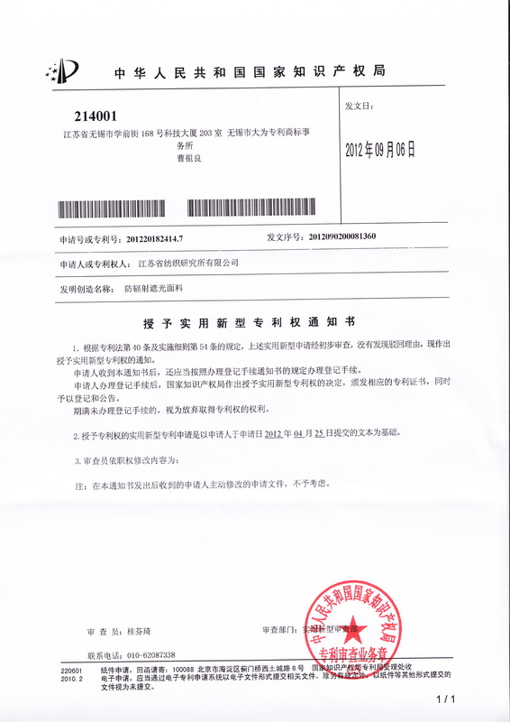 由江苏省纺织研究所有限公司申请的实用新型专利《防辐射遮光窗帘》、《阻燃、防静电多功能面料》,分别于2012年9月6日和2012年9月10日获得中华人民共和国国家知识产权局的正式授权。