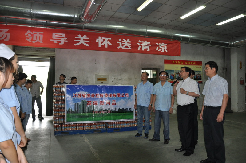 2014年7月28日下午,苏豪控股集团总裁周勇、副总裁钱一平一行,顶着高温,来到舒逸纺织公司生产车间送清凉,慰问500余名坚守一线岗位的纺织职工。