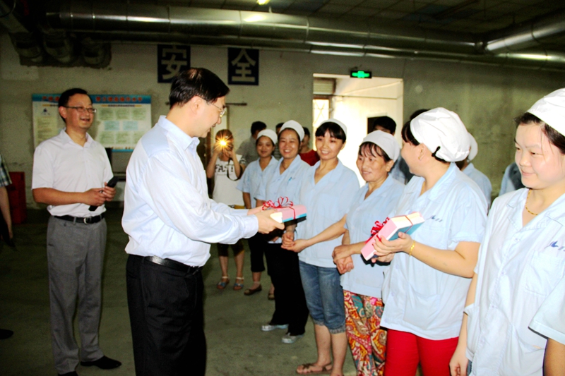 周勇总裁一行深入前纺车间、后纺车间各道工序,详细询问员工的工作、休息和防暑降温情况,叮嘱员工夏季高温要注意多休息,保持精力。在后纺车间,周总裁代表控股集团工会向纺织女工们发放《工会劳动保护工作手册》、《女职工劳动保护特别规定》等法律书刊及防暑饮品,坚持在一线的职工们倍受鼓舞,纷纷表示:立足岗位,做好本职,按质按量完成生产任务。