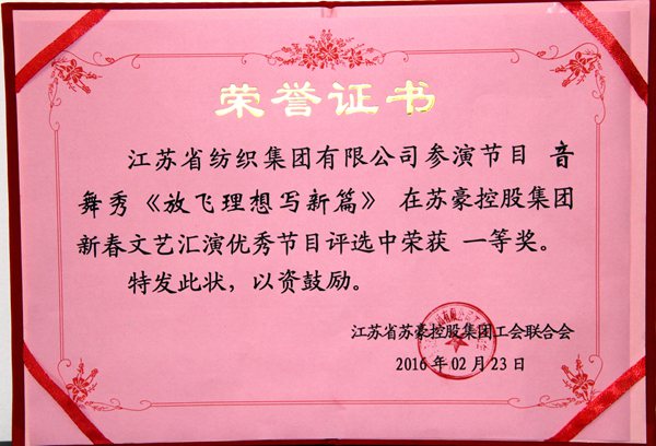 近日,从苏豪控股集团工会联合会委员会会议上获悉,纺织集团工会选送的音舞秀《放飞理想写新篇》荣获苏豪控股集团年度表彰大会暨新春文艺汇演一等奖。