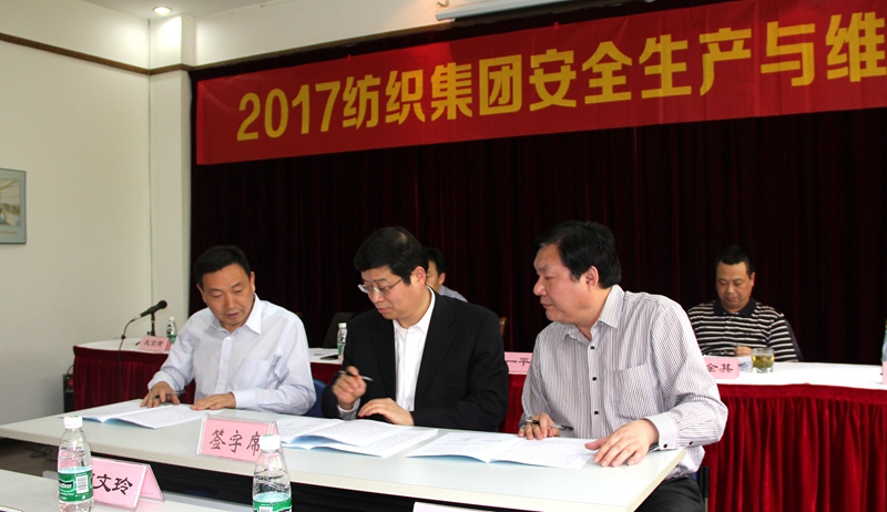 纺织集团党委副书记、总经理曹金其同志传达苏豪控股集团王正喜董事长在控股集团安全生产与维稳工作会议上的重要讲话,要求各公司学习贯彻王正喜同志关于安全与维稳方面的重要要求,扎扎实实做好安全生产与维稳工作。纺织集团安委会副主任、纪委书记陈建明同志通报苏豪控股集团和纺织集团安全生产检查情况,布置纺织集团2017年主要安全生产与维稳工作任务,舒逸公司负责人交流了安全生产工作做法,集团主要领导与班子成员、分管企业和部门分别签订安全生产与维稳工作责任书。
