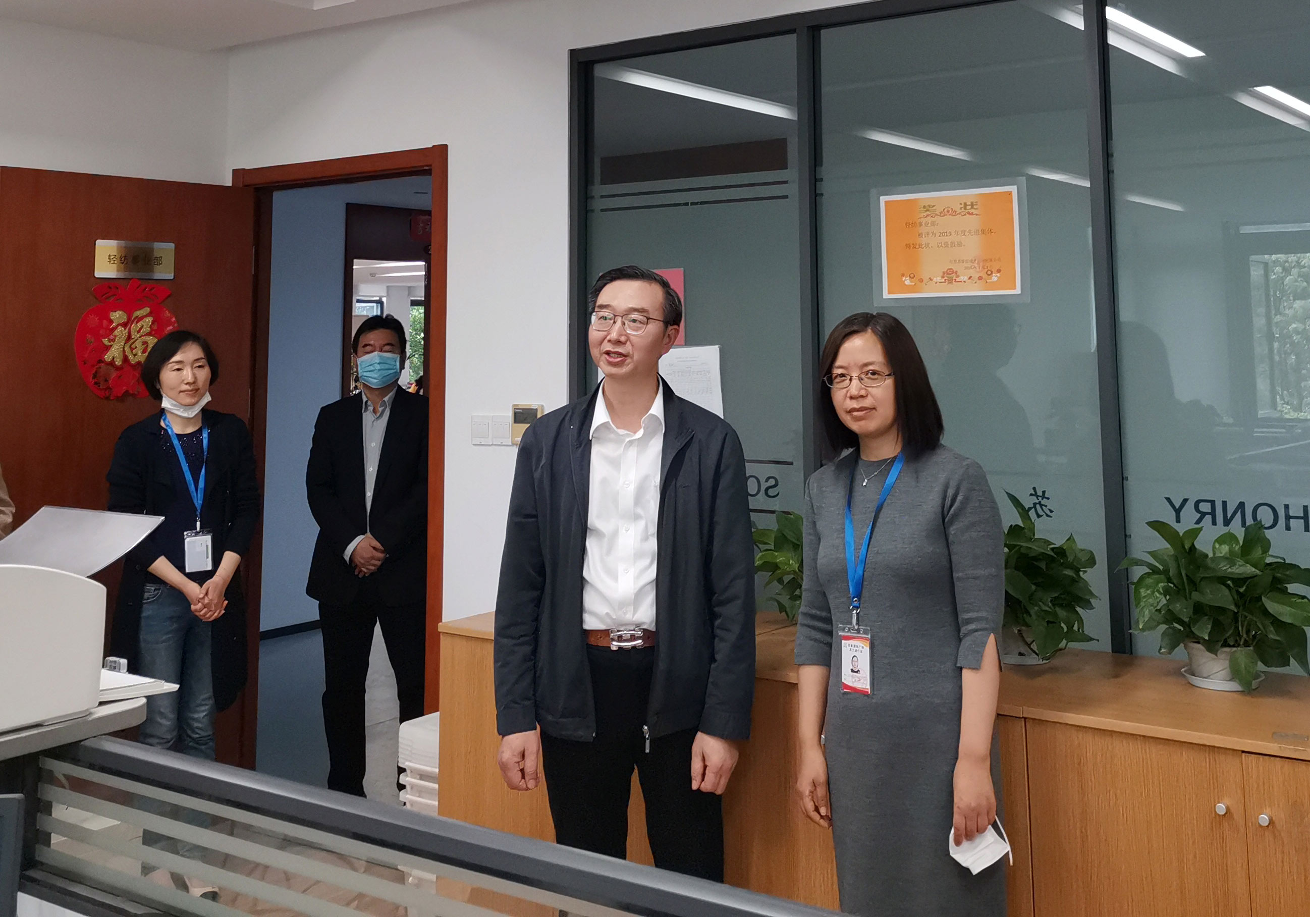 4月16日下午四时许,苏豪泓瑞公司轻纺事业部掌声雷动、气氛热烈,授牌仪式隆重举行。苏纺集团董事长张发松发表重要讲话,苏纺集团总经理、苏豪泓瑞公司董事长马宏伟向轻纺事业部负责人顾南燕授牌。苏纺集团副总经理、工会主席阚建兴、苏豪泓瑞公司总经理范斌文参加授牌仪式。