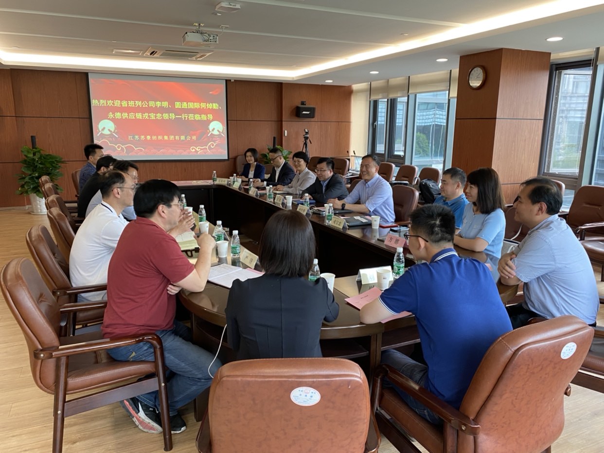 省班列公司董事长李明、圆通国际中国区总经理何焯勤及永德供应链董事长戎宝忠一行莅临苏纺集团调研